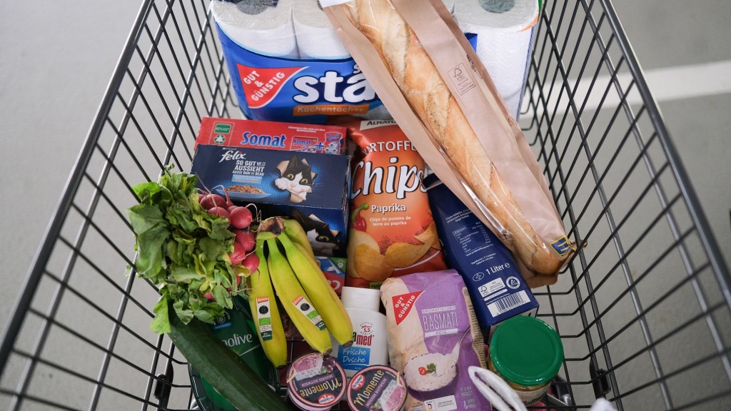 In einem Einkaufswagen liegen nach einem Einkauf Lebensmittel und Waren des täglichen Bedarfs.